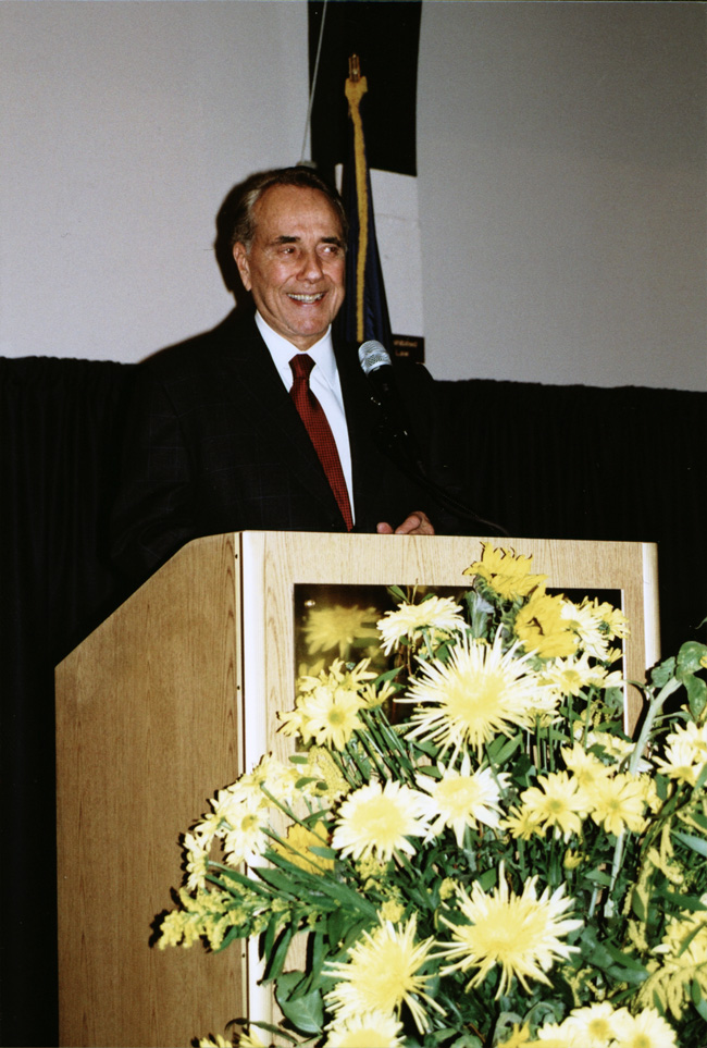 Senator Bob Dole stands at a podium while giving a speech on Kansas Day. Flowers sit in the foreground.
