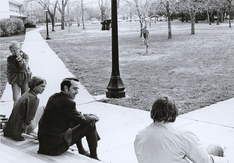 Senator Dole sitting with students outside at Fort Hays State University | Dole Archive Collections
