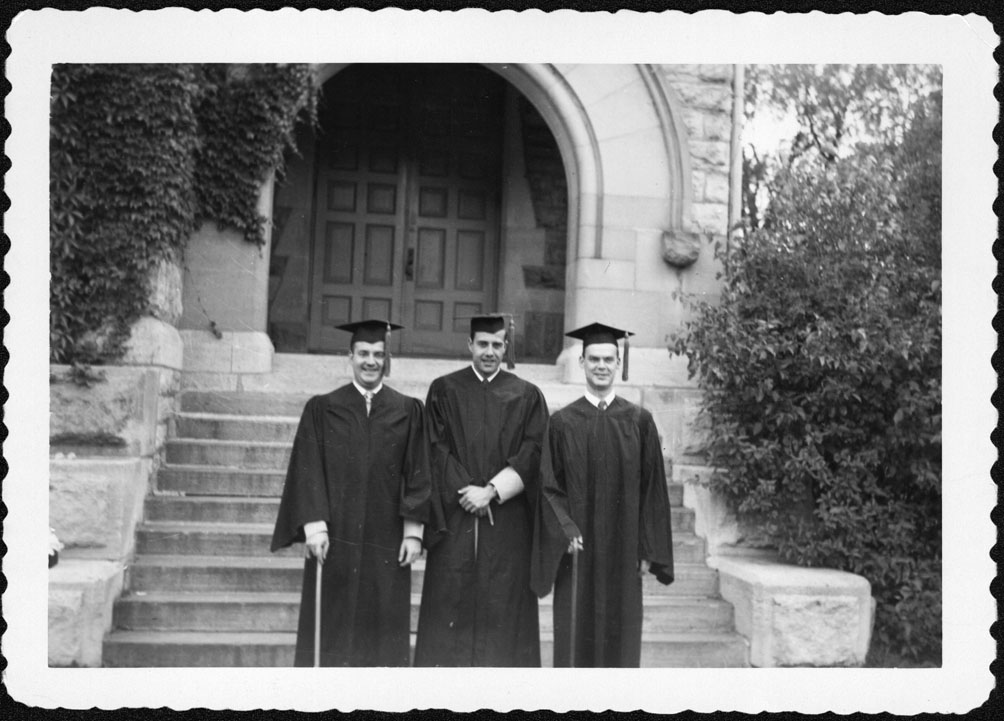 Item 1: Bob Dole graduating from Washburn Law School; Topeka, KS; c. 1952. Black and white, snapshot, Dole, Robert J., 1923-; three men standing together in front of steps in graduation regalia.