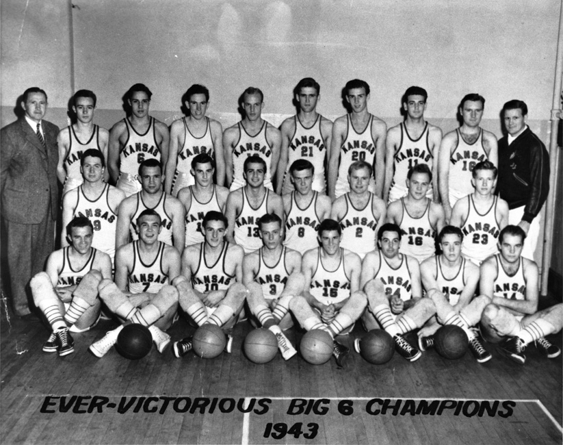 Dole, Robert J., 1923-; Phog, Alan; Bob Dole Player #6, upper left of photo. -- Inscriptions: Front: Ever-Victorious Big 6 Champions 1943