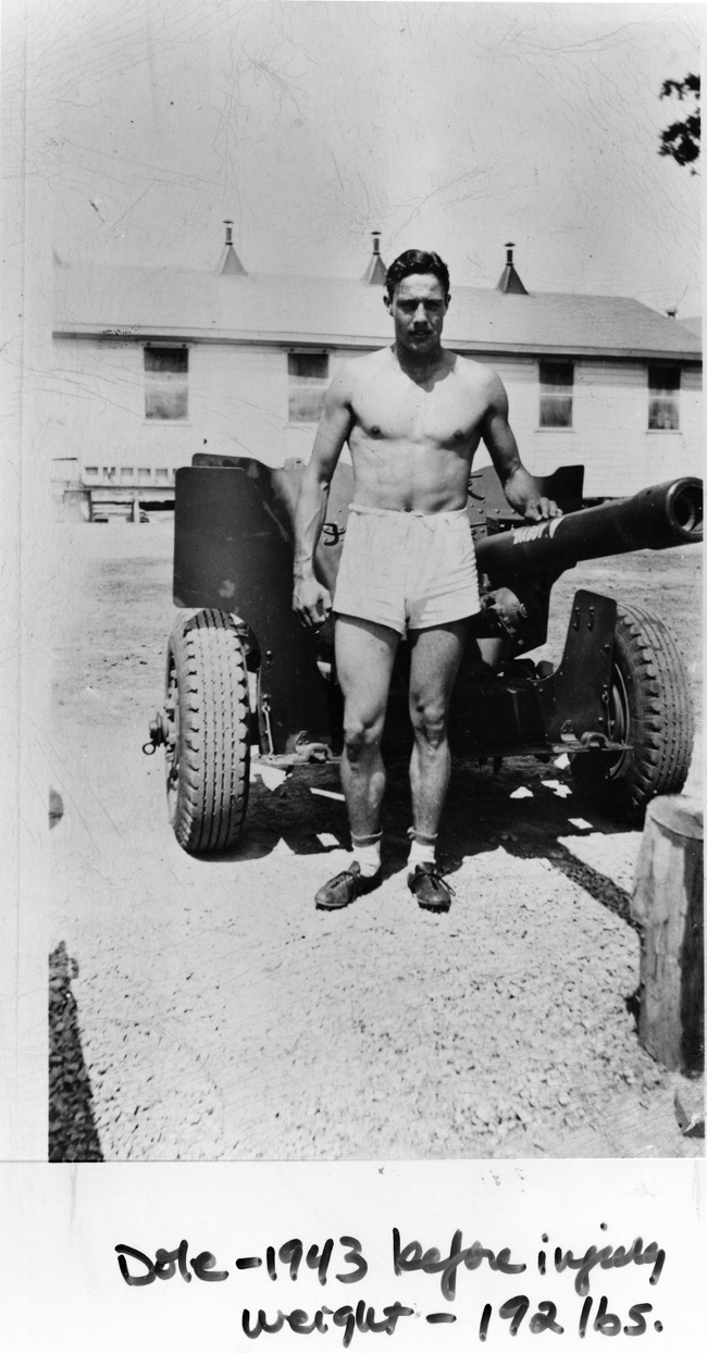 Dole, Robert J., 1923-; Dole standing in front of artillery without shirt. Inscriptions: Dole-1943 before injury- 192 lbs