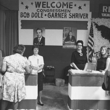 Ladies at booth with a banner reading Welcome Congressmen Bob Dole and Barner Shriver Inscriptions: Booth at State Fair 1967 Hutchinson