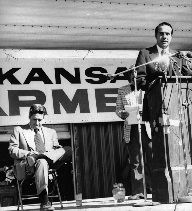 Dole, Robert J., 1923-; Roy, William R.; Bob Dole is at the podium making a speech with Bill Roy sitting in the background taking notes; the microphone stand has a strong glare, Inscriptions: [1974] Dr. Bill Roy, Hutchinson Debate