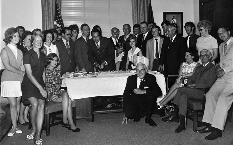 Dole, Robert J., 1923-; Group gathered around birthday cakes, Dole is in the center cutting a cake; Inscriptions: 1970 B-Day party for Dole (staff, senators)