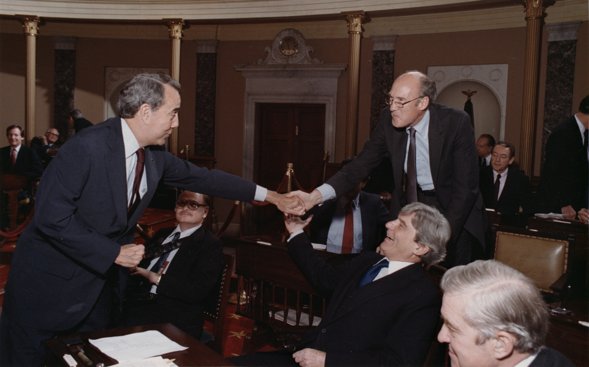 McConnell, Mitch; Goldwater, Barry M. (Barry Morris), 1909-1998; Dole, Robert J., 1923-; Simpson, Alan K.; Warner, John W., 1927-; Hatch, Orrin, 1934-; Bob Dole is shaking hands with Alan Simpson, U.S. Capitol, Inscriptions: l to r foreground: Dole, R.J.; -; Warner, J.; Simpson, A.l