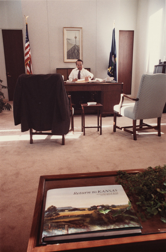 Bob Dole is in his Senate Kansas office, Washington, DC., he has a pen in his mouth Return to Kansas book on coffee table. Inscriptions: USED- Date May 13, 1985