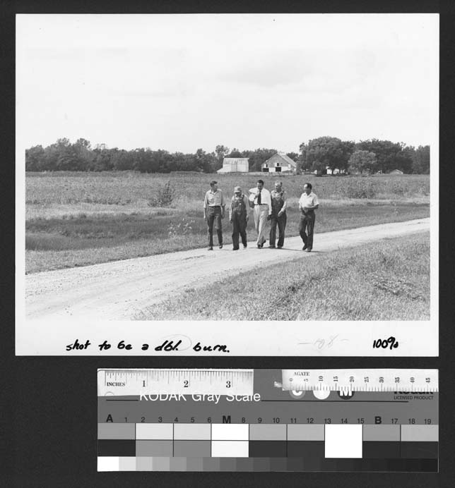 Black and white, landscape, notes: Senator Dole and farmers on country road, Inscriptions: shot to be a dbl. burn 100%