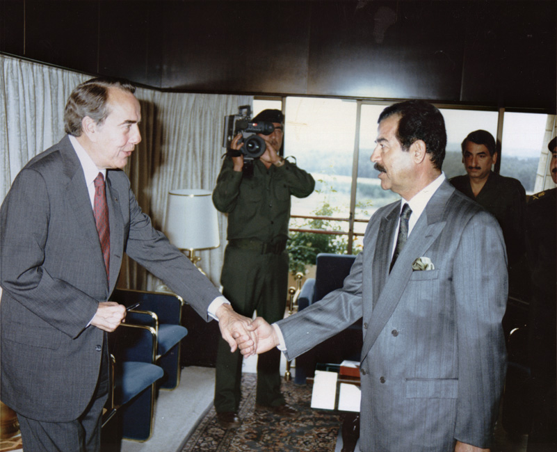 Item 2: Bob Dole and Saddam Hussein shake hands, April 12, 1990