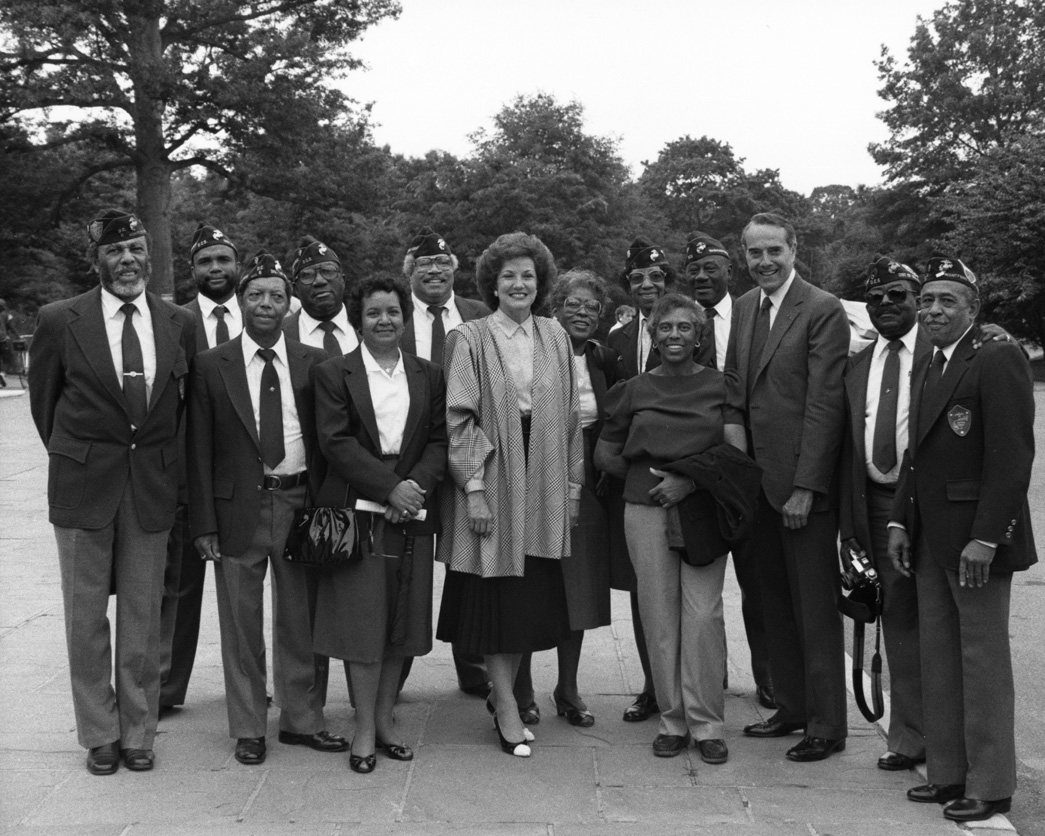 Senator Bob Dole and his wife, Elizabeth, posing with veterans, 1990