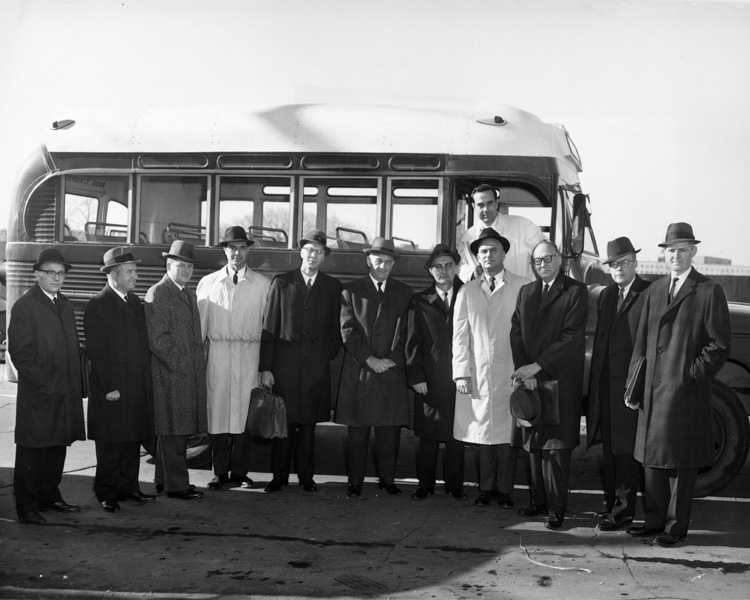Preston, Jim; Dole, Robert J., 1923-; Carlson, Frank, 1893-1987; Avery, William Henry, 1911-2009; Austin, Whitley; MacConkey, Joe; Rosen, Lester; Lillard, Tom; Olsen, Norris; Ostenburg, W. M.; Ramsey, Carl; Rundquist, Carl; Everyone is standing together in front of a bus in coats and hats, Notes: and also with Don Bradford, Director of Economic Adjustment, Office of the Secretary of Defense. Mr. Bradford, members of his staff and representatives of other federal agencies, plan to visit Salina in Mid-January.