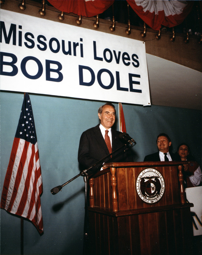 Dole, Robert J., (1923-). Bob Dole is standing behind a brown podium that has the seal of Missouri on it. Behind him is an American flag and a sign that says, "Missouri Loves BOB DOLE." There are two unidentified people in the picture.