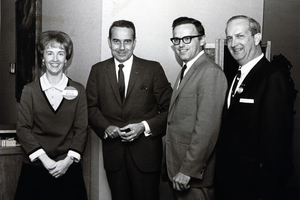 Unidentified woman; Dole, Robert J., 1923-; unidentified man and Sebelius, Keith. The inscription on the back of the photograph says, "Campaign scrapbook 1968, Helping the ticket Keith Sebelius, Bob Dole spent several days in western Kansas with his friend. Keith Sebelius in a special effort to help Keith made sure Dole's congressional seat remained Republican."