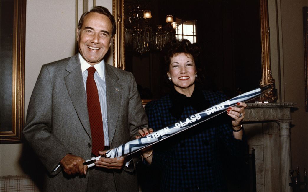 Dole, Robert J., 1923-; Dole, Elizabeth Hanford. Bob Dole and Elizabeth Dole are posed holding up a blue and white umbrella that has a piece of plastic [?] covering it. The plastic says, "FIBER GLASS SHAFT." There is a portrait, a mirror and chandelier visible in the background.