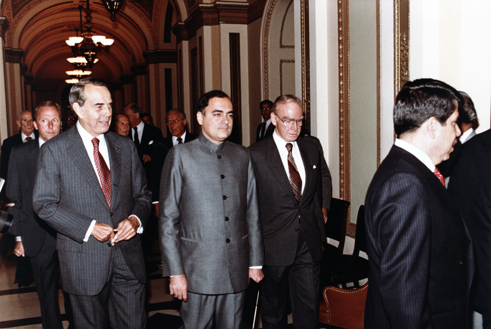 Dole, Robert J., 1923-; Michel, Robert H., 1923-; Thurmond, Strom, 1902-2003; Gandhi, Rajiv, 1944-1991. Bob Dole is talking to Rajiv Gandhi (on Bob Dole's left). They are walking down a hallway. There is an unidentified man walking on Rajiv Gandhi's left. There are a number of unidentified men behind and in front of Dole and Gandhi. There is a mirror and chairs visible.