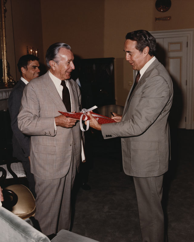 White House Chief of Staff Donald Regan giving Bob Dole a Peace Pipe | Dole Archive Collections