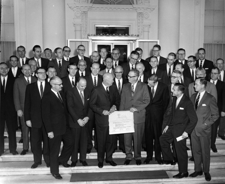 Eisenhower, Dwight D. (Dwight David), 1890-1969; Dole, Robert j. Dole; photograph of the Freshmen Republicans Members of Congress in 1961; Dole is in the top proper right corner, Eisenhower is in front holding the proper right corner of the Tribute to the new members