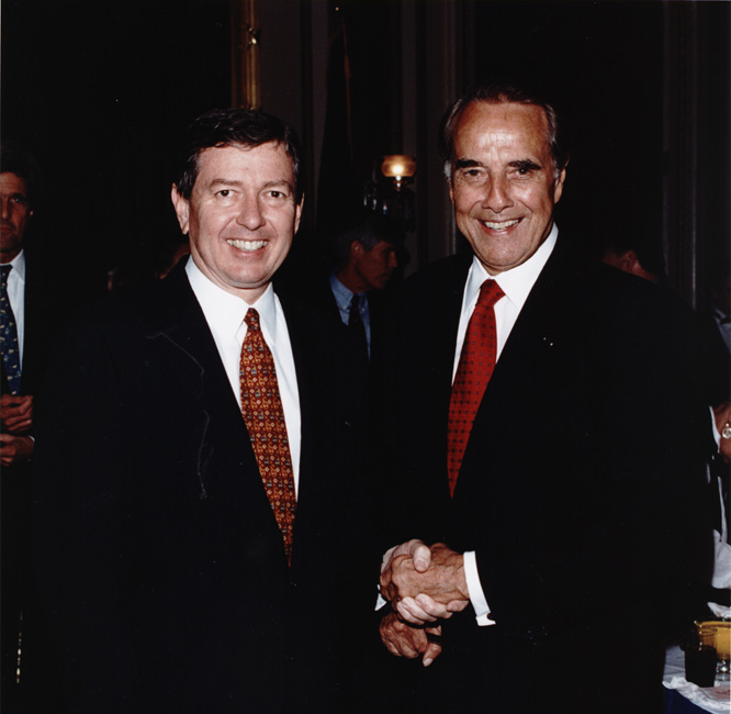 Bob Dole posed with Senator John Ashcroft at Retirement party