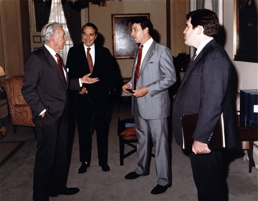 Bob Dole speaking with Don Regan, Charles Grassley and Will Ball