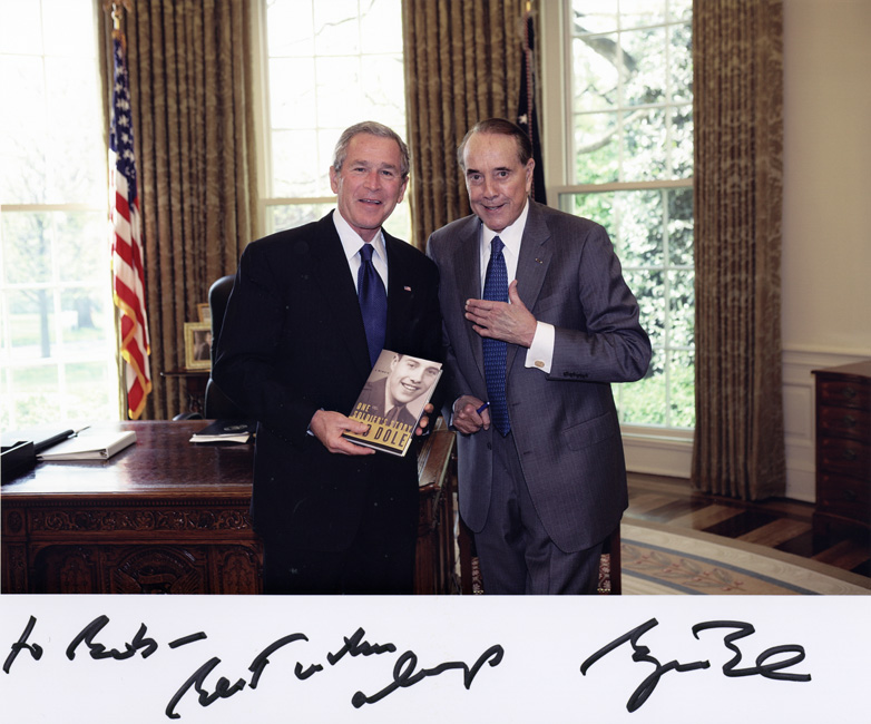 Dole, Robert J., 1923-; Bush, George W. (George Walker), 1946-; President Bush is holding One Soldier's Story, the photo was taken in the White House, Dole is holding a pen and has his hand on his chest