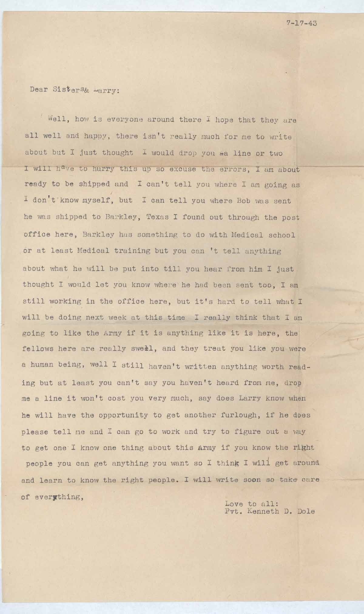 line or two I will have to hurry this up so excuse the errors, I am about ready to be shipped and I can’t tell you where I am going as I don’t know myself, but I can tell you where Bob was sent [sic] he was shipped to Barkley, Texas [sic] I found out through the post office here, Barkley has something to do with Medical school or at least Medical training but you can’ t [sic] tell anything about what he will be put into till [sic] you hear from him [sic] I just thought I would let you know where he had been sent too, I am still working in the office here, but it’s hard to tell what I will be doing next week at this time [sic] I really think that I am going to like the Army if it is anything like it is here, the fellows here are really swell, and they treat you like you were a human being, well I still haven’t written anything worth read-ing but at least you can’t say you haven’t heard from me, drop me a line it won’t cost you very much, say does Larry know when he will have the opportunity to get another furlough, [sic] if he does please tell me and I can go to work and try to figure out a way to get one [sic] I know one thing about this Army if you know the right people you can get anything you want so I think I will get around and learn to know the right people. I will write soon so take care of everything, [sic]