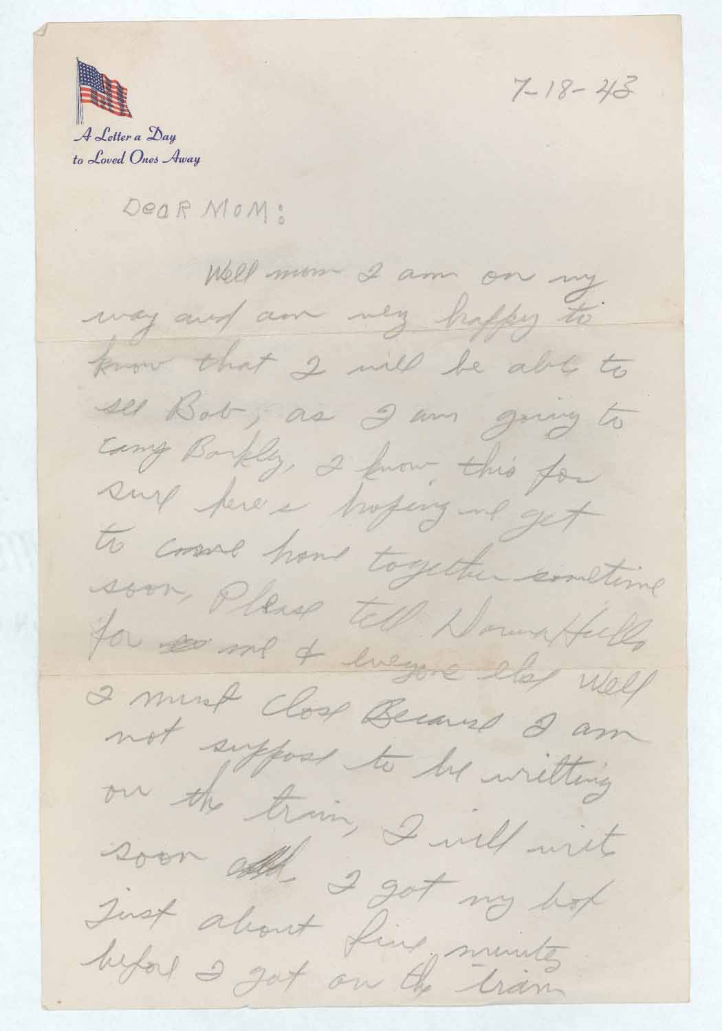 Well mom I am on my way and am vey [sic] happy to know that I will be able to see Bob, as I am going to Camp Barkley, I know this for sure heres [sic] hoping we get to come home together sometime soon, [sic] Please tell Doran Hello [sic] for co me & everyone else well I must close Because [sic] I am not suppose [sic] to be writting [sic] on the train, I will write soon cold,[sic] I got my box just about five minutes before I got on the train and does it ever come in handy, for me and some of the other fellows thanks’ [sic] a million for it mom and you can send some more anytime, write Bob & tell him where I am going so he can find me he should know to go about it better than I do. Well goodbye and all my love [sic]