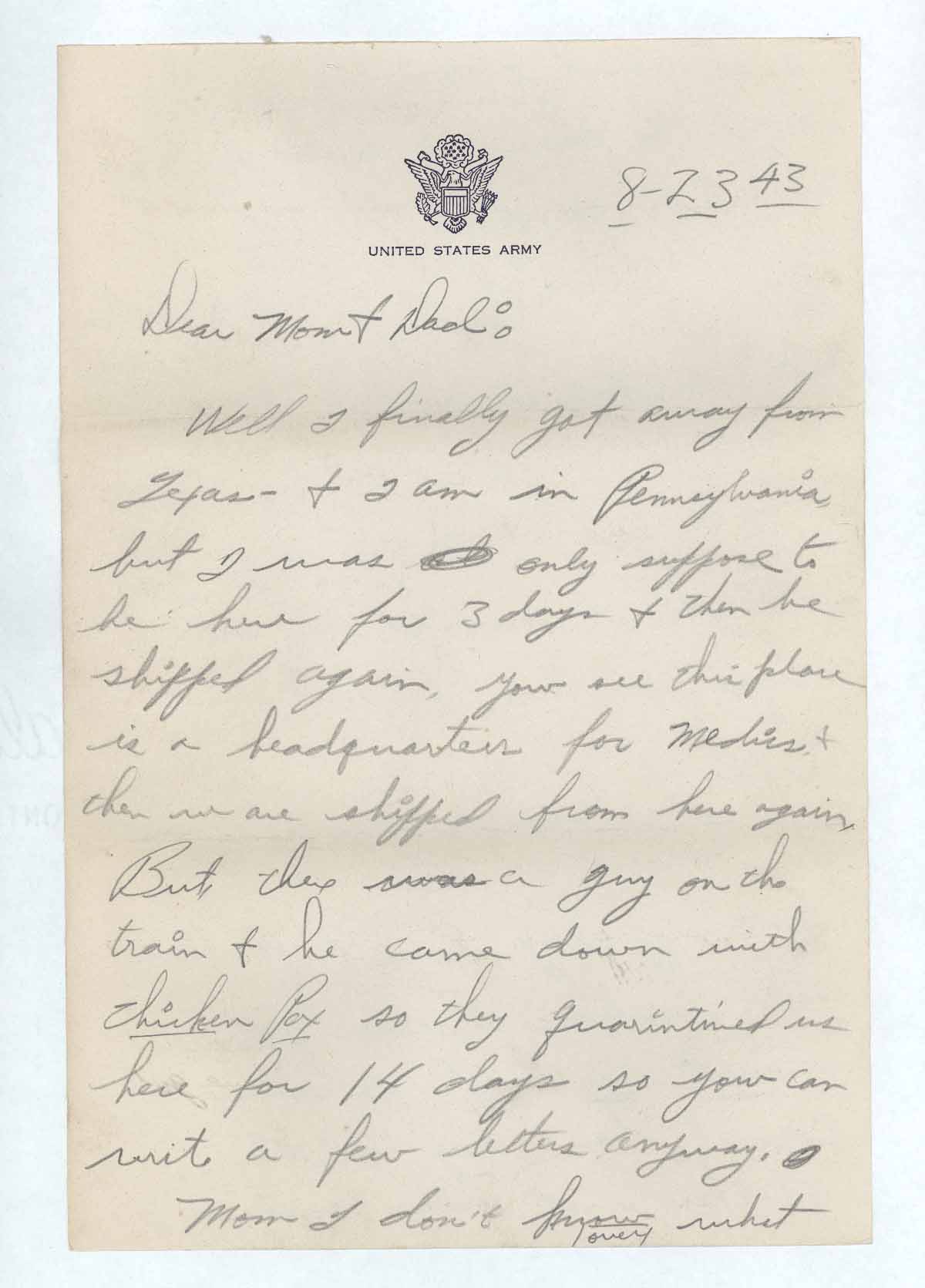 suposse [sic] to be here for 3 days & then be shipped again, you see this place is a headquarters for Medics & then we are shipped from here again. But there was a guy on the train & he came down with Chicken Pox so they quarintined us here for 14 days so you can write a few letters anyway. [scratched out letter]