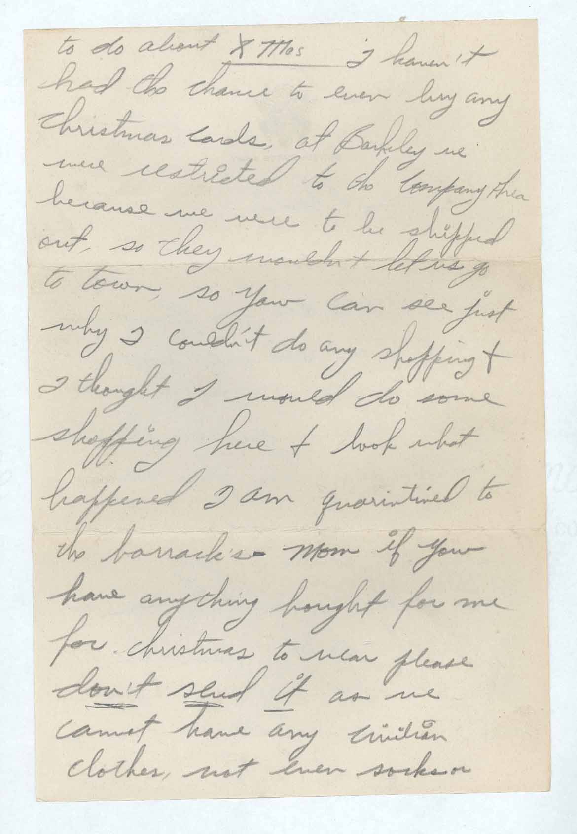 to do about X Mas I haven’t had the chance to even buy any Christmas Cards, at Barkeley we were restricted to the Company Area because we were to be shipped out, so they wouldn’t let us go to town, so you can see just why I couldn’t do any shopping & I thought I would do some shopping here & look what happened I am quarintined to the barracks- Mom if you have anything bought for me for christmas to wear please don’t send it as we cannot have any civilian clothes, not even socks or