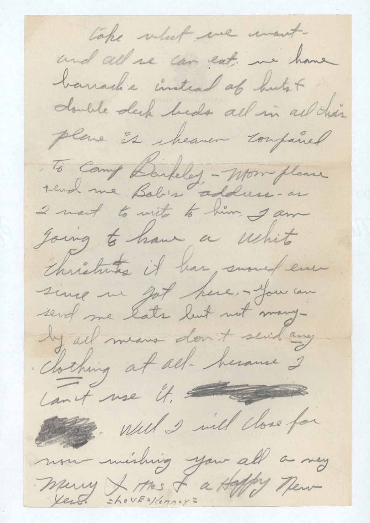 Christmas it has snowed ever since we got here. – You can send me eats but not many – by all means don’t send any clothing at all – because I can’t use it. [three words scratched out] Well I will close for now wishing you all a very Merry X Mas & a Happy New Year.