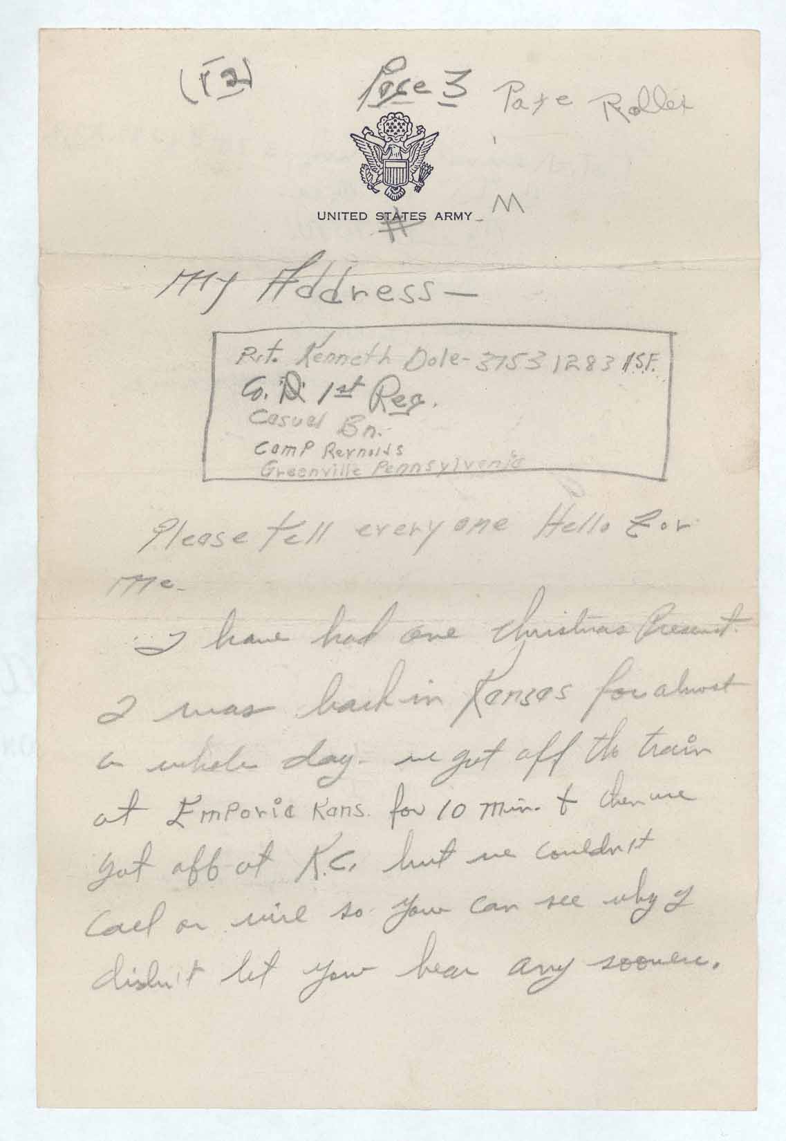 I have had one Christmas Present [sic]. I was back in Kansas for almost a whole day. we [sic] got off the train at Emporia Kans [sic] for 10 Min. [sic] & then we got off at K.C. but we couldn’t call or wire so you can see why I didn’t let you hear any sooner.