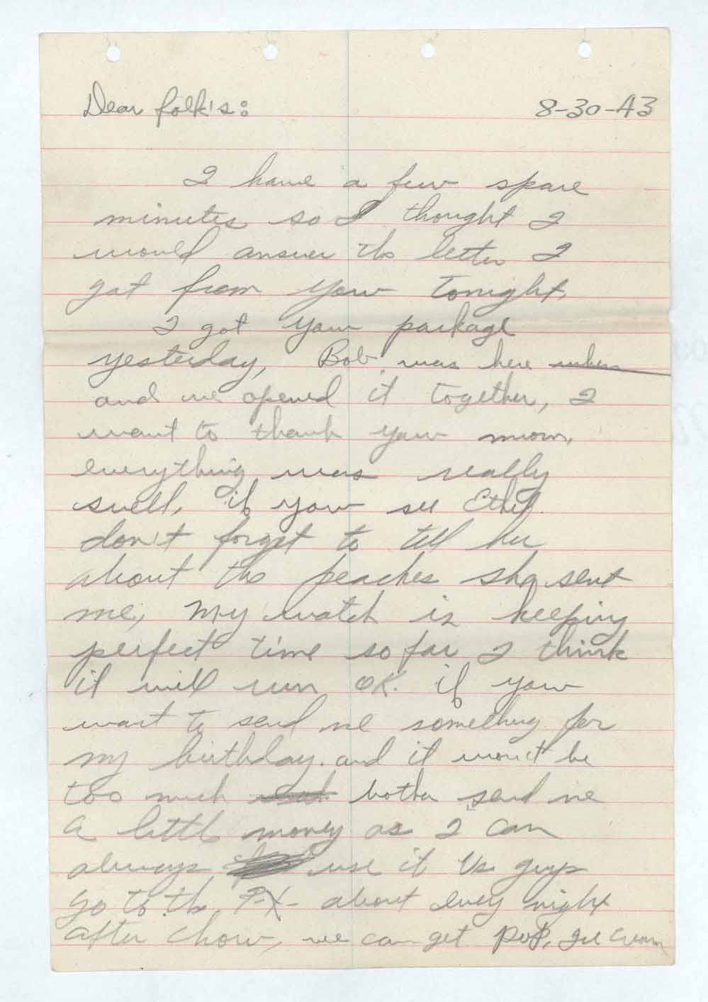 I got your package yesterday, Bob was here when and we opened it together, I want to thank you mom, everything was really swell, if you see Ethel don’t forget to tell her about the peaches she sent me. My watch is keeping perfect time so far I think it will run ok. if you want to send me something for my birthday and it won’t be too much mail
