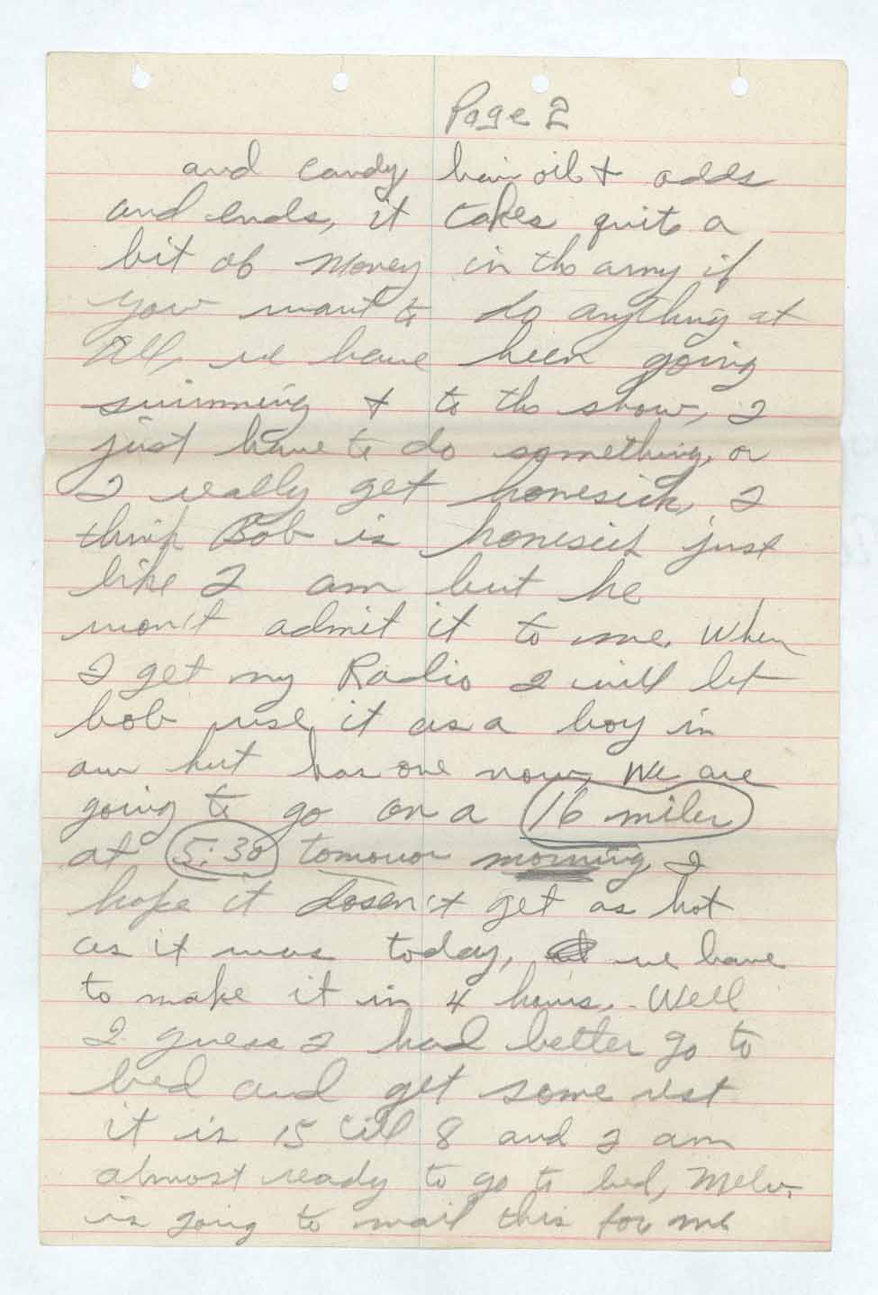 and candy, hair oil & odds and ends, it takes quite a bit of money in the army if you want to do anything at all, we have been going swimming & to the show, I just have to do something, or I really get homesick. I think Bob is homesick just like I am but he won’t admit it to me. When I get my Radio I will let bob use it as a boy in our hut has one now. We are going to go on a 16 miler [16 and miler are circled] at 5:30 [5:30 is circled] tomorrow morning . I hope it doesn’t get as hot as it was today, I we have to make it in 4 hours. Well I guess I had better go to bed and get some rest it is 15 till 8 and I am almost ready to go to bed. Melv. is going to mail this for me