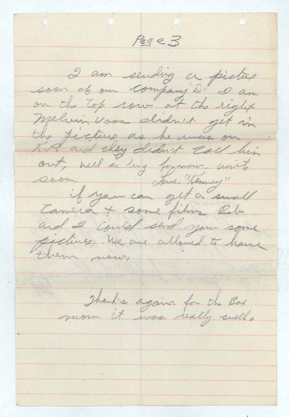 I am sending a picture soon of our company “D” I am on the top row at the right Melvin Voos didn’t get in the picture as he was on K.P. and they didn’t call him out, well so long for now. Write soon. Love. “Kenney”