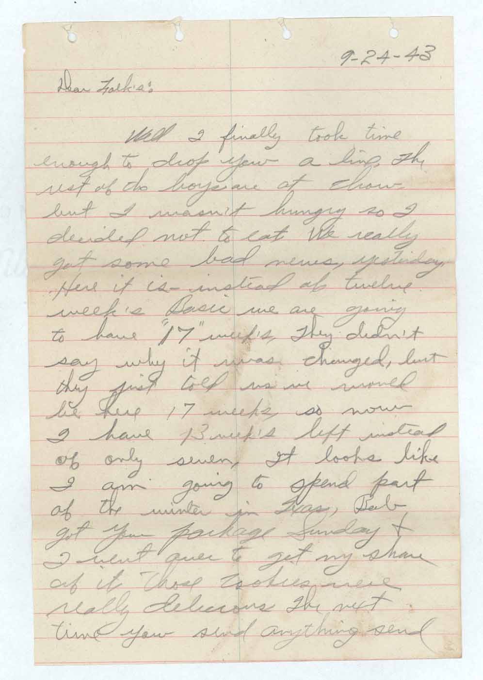 Well I finally took time enough to drop you a line. The rest of the boys are at chow but I wasn’t hungry so I decided not to eat. We really got some bad news, yesterday. Here it is – instead of twelve week’s Basic we are going to have “17” week’s. They didn’t say why it was changed, but they just told us we would be here 17 weeks, so now I have 13 week’s left instead of only seven. It looks like I am going to spend part of the winter in Texas, Bob got your package Sunday & I went over to get my share of it. Those cookies were really delicious. The next time you send anything send