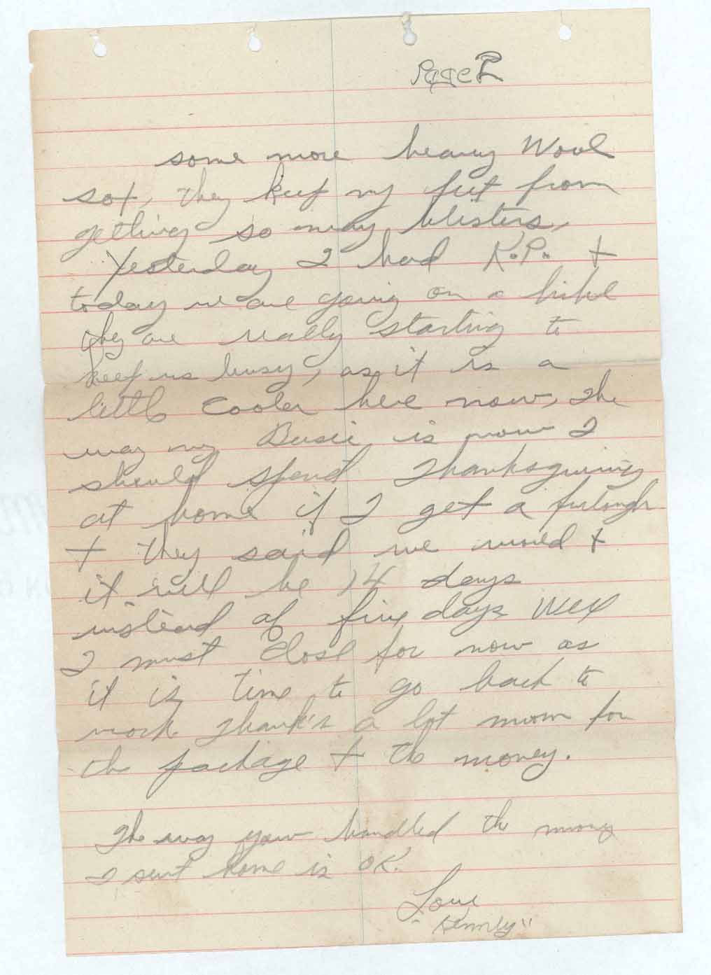 some more heavy Wool sox, they keep my feet from getting so many blisters. Yesterday I had K.P. & today we are going on a hike they are really starting to keep us busy, as it is a little cooler here now. The way my Basic is now I should spend Thanksgiving at home if I get a furlough & they said we would & it will be 14 days instead of five days. Well I must close for now as it is time to go back to work. Thank’s a lot mom for the package & the money.