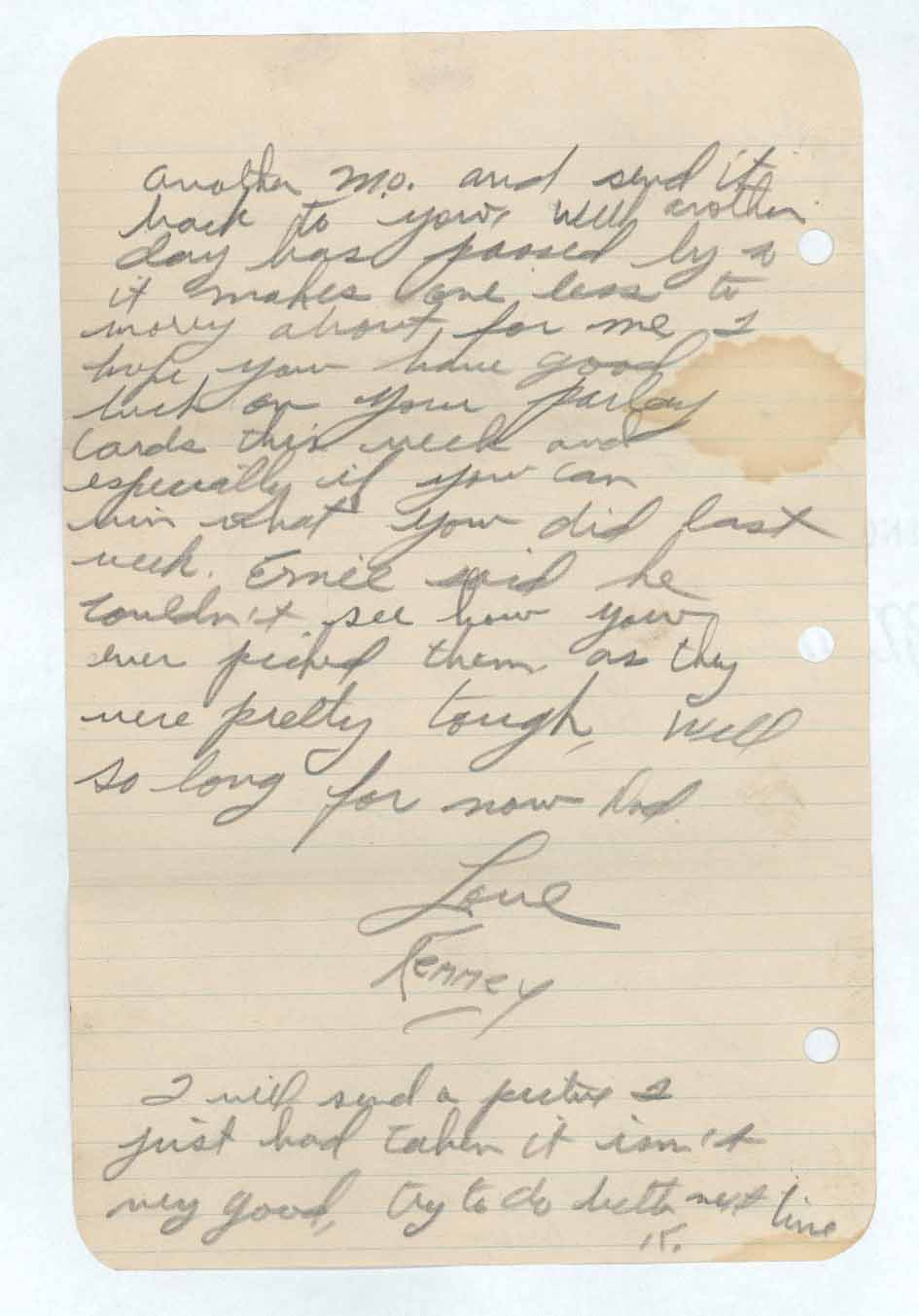 another M.o. [money order] and send it back to you. Well another day has passed by & it makes one less to worry about for me I hope you have good luck on your parlay cards this week and especially if you can win what you did last week. Ernie said he couldn’t see how you ever picked them as they were pretty tough. Well so long for now Dad.