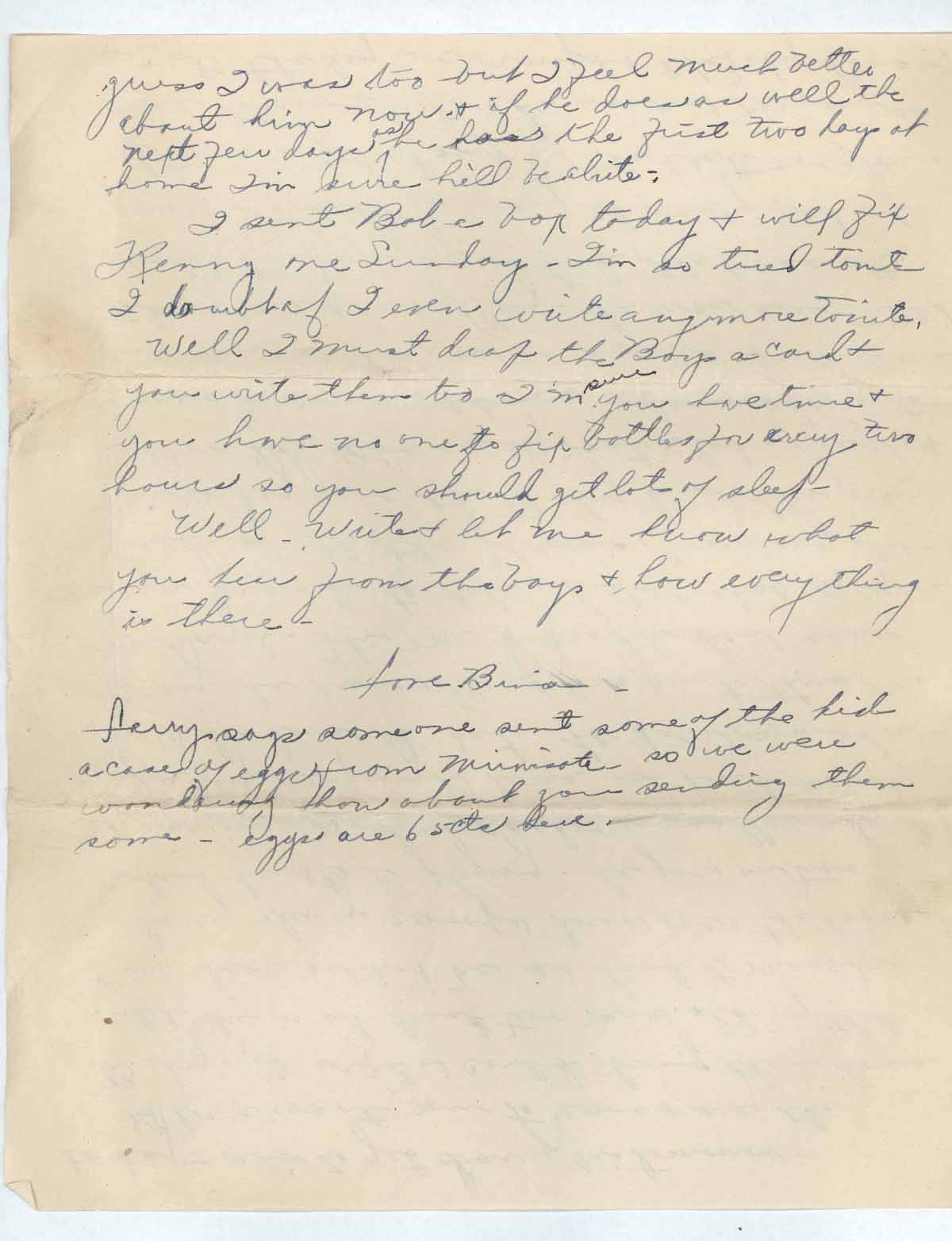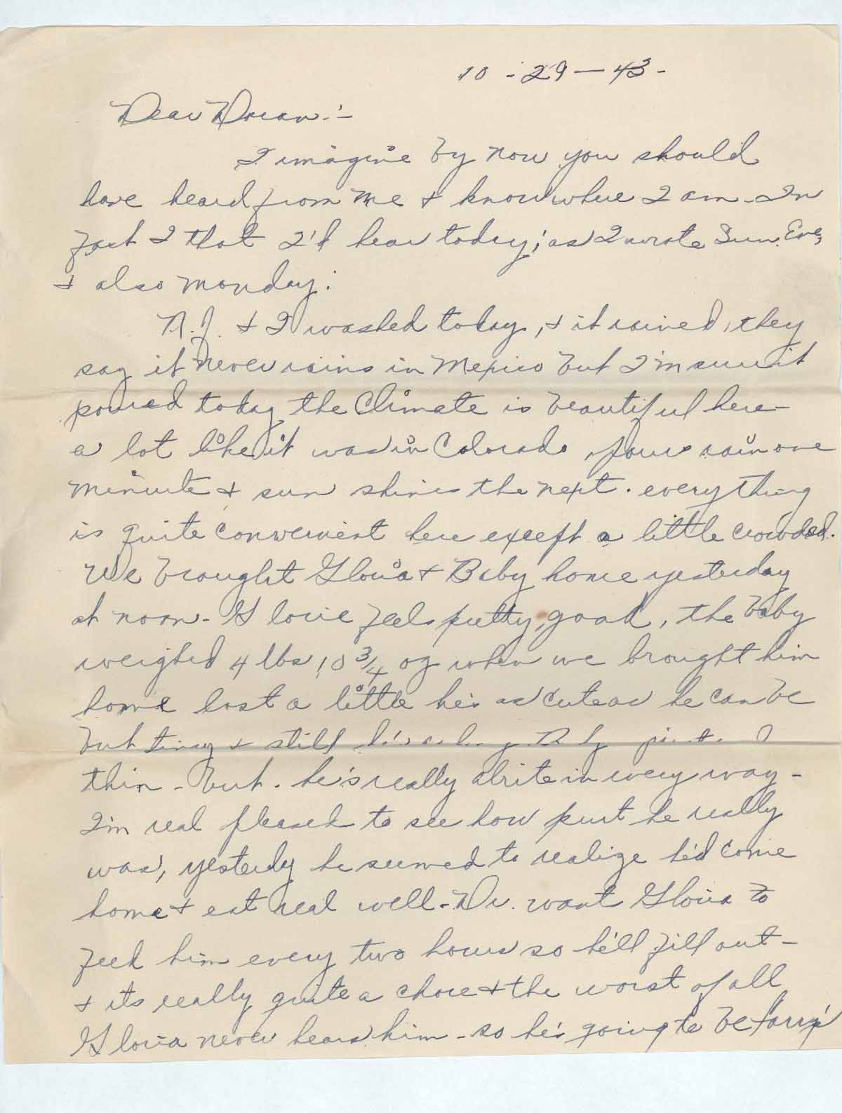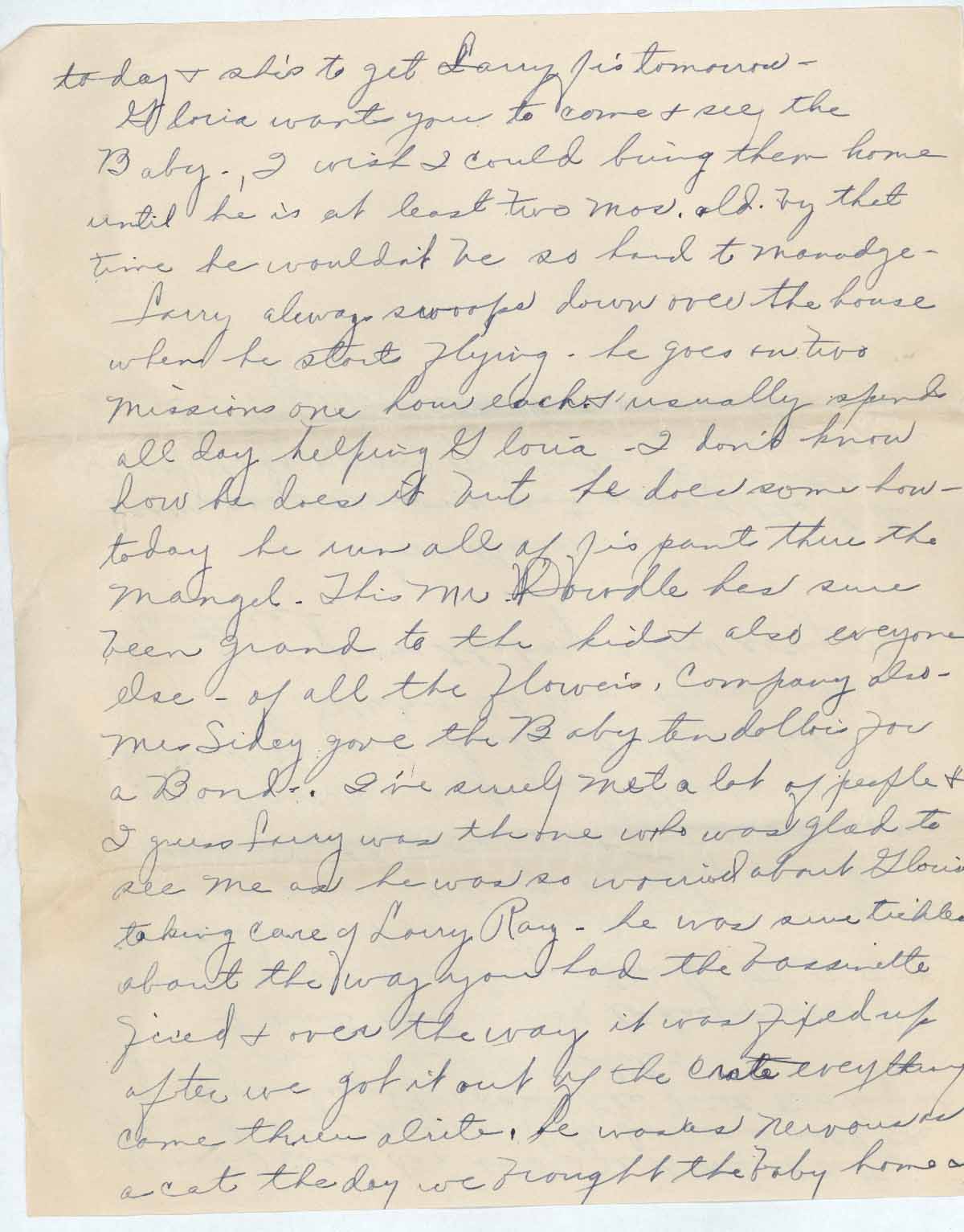 Gloria wants you to come & see the Baby., I wish I could bring them home until he is at least two mos.[sci] old by that time he wouldn’t be so hard to manadge [sic] - Larry always swoops down over the house when he starts flying – he goes on two missions one hour each. I usually spend all day helping Gloria, I don’t know how he does it but he does somehow – today he run all of his pants thru the Mangel. This Mr. Dowdle has sure been grand to the kids & also everyone else – of all the flower’s, company also – Mr. Sidey gave the Baby ten dollars for a Bond. I’ve surely met a lot of people & I guess Larry was the one who was glad to see me as he was so worried about Gloria taking care of Larry Ray – he was sure tickled about the way you had the bassinette fixed & over the way it was fixed up after we got it out of the crate everything came threw [sic] alrite[sic]. He was nervous as a cat the day we brought the baby home, guess I was too but I feel much better about him now & if he does as well the next few days as he has the first two days at home I’m sure he’ll be alrite [sic].