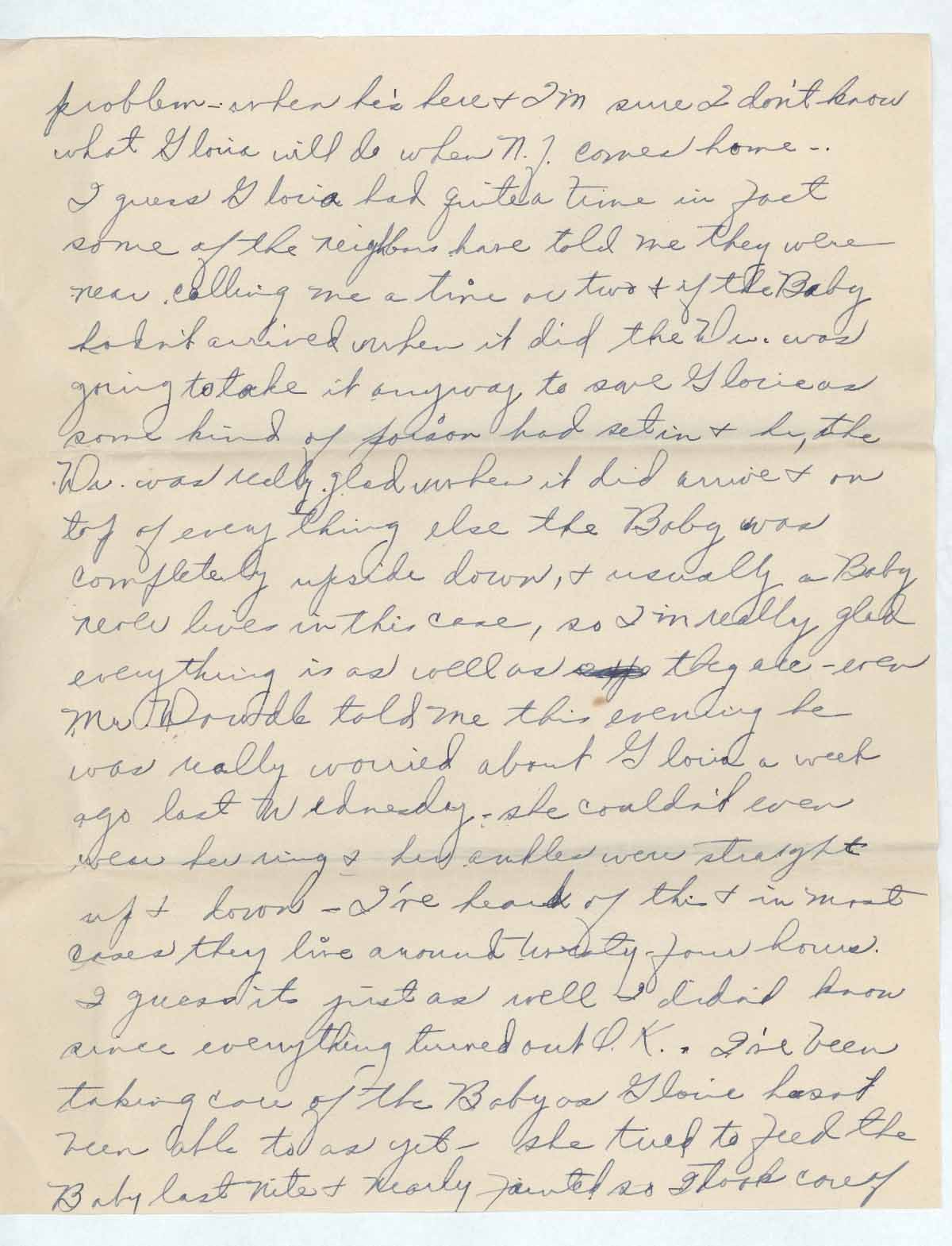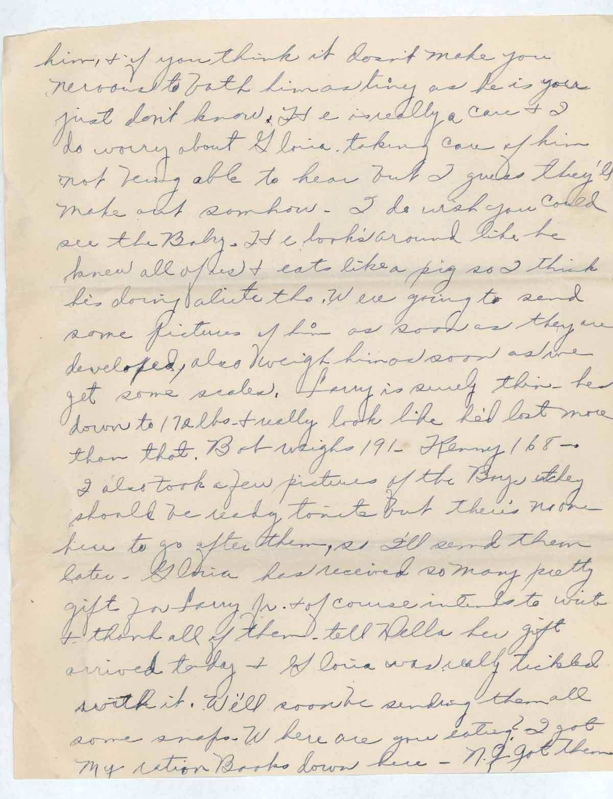 We brought Gloria & Baby home yesterday at noon. Gloria feels pretty good, the baby weighed 4lbs 10 ¾ oz when we brought him home lost a little he’s as cute as he can be but tiny & still he’s a long Baby – just real thin – but- he’s really alrite [sic] in every way – I’m real pleased to see how purt [sic] he really was, yesterday he seemed to realize he’d come home & eat real well. Dr. wants Gloria to feed him every two hours so he’ll fill out - & its really quite a chore & the worst of all Gloria never hears him – so he’s going to be Larry’s problem – when he’s here & I’m sure I don’t know what Gloria will do when N.J. comes home-. I guess Gloria had quite a time in fact some of the neighbors have told me they were near calling me a time or two & if the Baby hadn’t arrived when it did the Dr. was going to take it anyway to save Gloria as some kind of poison had set in & he, the Dr. was really glad when it did arrive & on top of every thing else the Baby was completely upside down, & usually a Baby never lives in this case, so I’m really glad everything is as well as supp they are –even Mr. Dowdle told me this evening he was really worried about Gloria a week ago last Wednesday she couldn’t even wear her ring & her ankles were straight up & down – I’ve heard of this & in most cases they live around twenty-hours. I guess its just as well I didn’t know since everything turned out O.K.. I’ve been taking care of the Baby as Gloria hasn’t been able to as yet – she tried to feed the Baby last nite & nearly fainted so I took care of him & if you think it doesn’t make you nervous to bath him as tiny as he is you just don’t know. He is really a case & I do worry about Gloria taking care of him not being able to hear but I guess they’ll make out somehow. I do wish you could see the Baby. He looks around like he knew all of us & eats like a pig so I think he’s doing alrite [sic] tho [sic]. We’re going to send some pictures of him as soon as they are developed, also weigh him as soon as we get some scales. Larry is surely thin- he’s down to 172 lbs & really look like he’d lost more than that. Bob weighs 191- Kenney 168-. I also took a few pictures of the Baby they should be ready tonite but their’s no one here to go after them, so I’ll send them later. Gloria has received so many pretty gifts for Larry Jr. & of course intends to write & thank all of them – tell Della her gift arrived today & Gloria was really tickled with it. We’ll soon be sending them all some snaps. Where are you eating? I got my ration Books down here – N.J. got them today & she’s to get Larry Jr’s tomorrow-