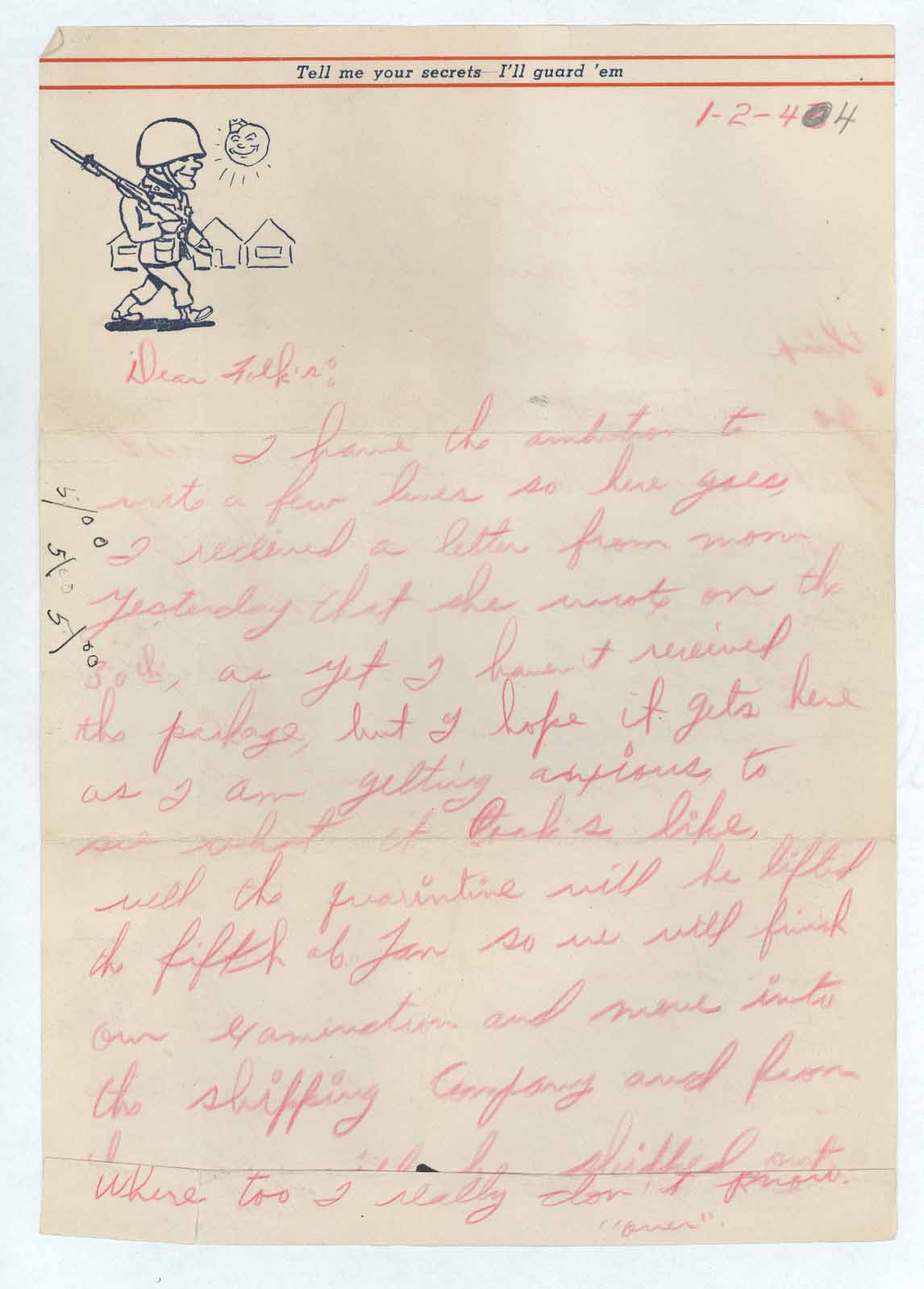 [5/00 3 times at the left margin] mom yesterday that she wrote on the 30th, as yet I haven’t received the package, but I hope it gets here as I am getting anxious, to see what it look’s like, well the quarantine will be lifted the fifth of Jan so we will finish our examination and move into the shipping company and from where [page has been cut and first part of the text is missing to the following] shipped out. Where too I really don’t know. “over”