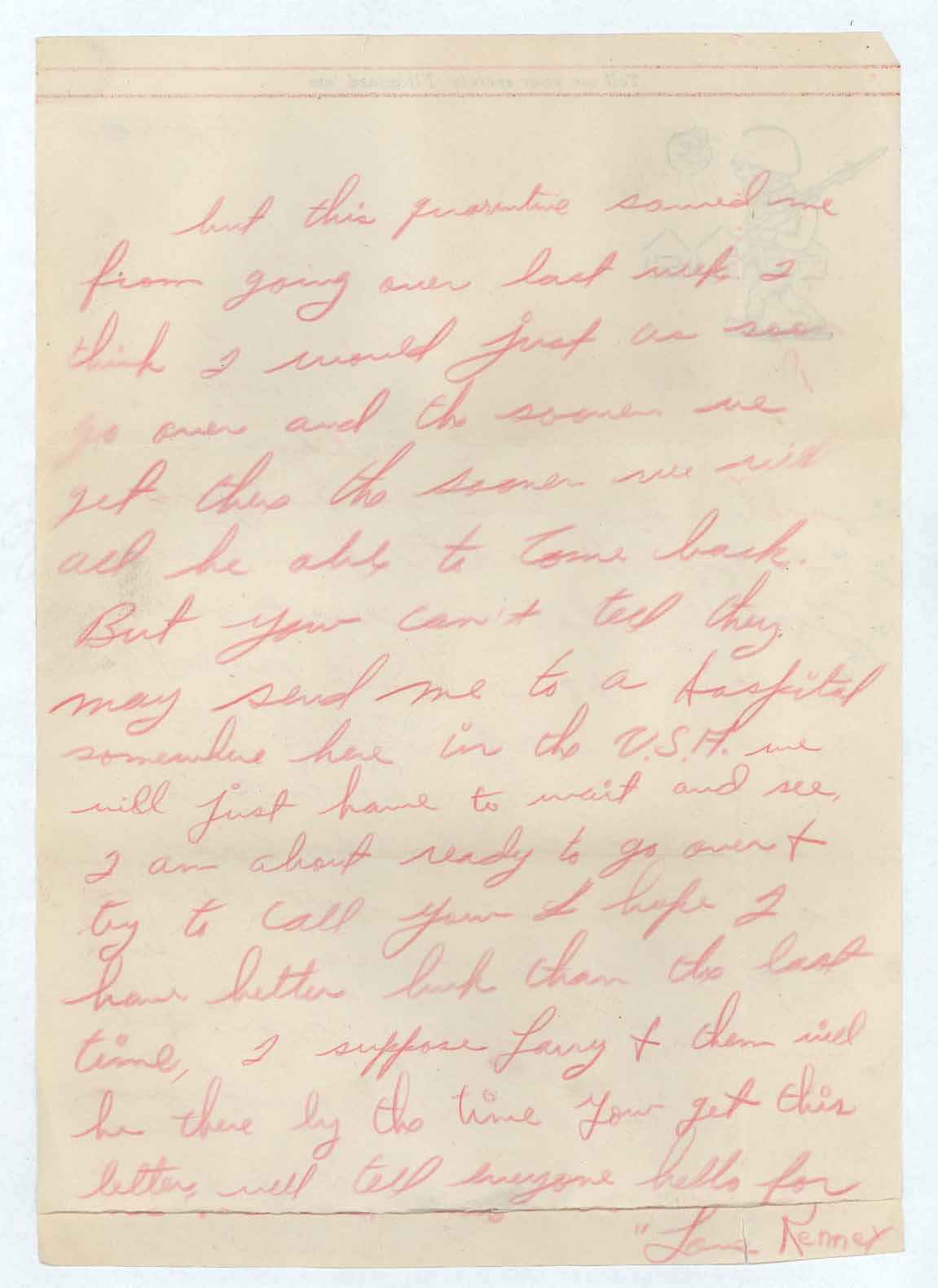 But this quarantine saved me from going over last week I think I would just as soon go over and the sooner we get this the sooner we will all be able to come back. But you can’t tell they may send me to a hospital somewhere here in the U.S.A. we will just have to wait and see, I am about ready to go over & try to call try I hope I have better luck than the last time, I suppose Larry and Clem will be there by the time you get this letter, well tell everyone hello for [page has been cut and the text is missing]
