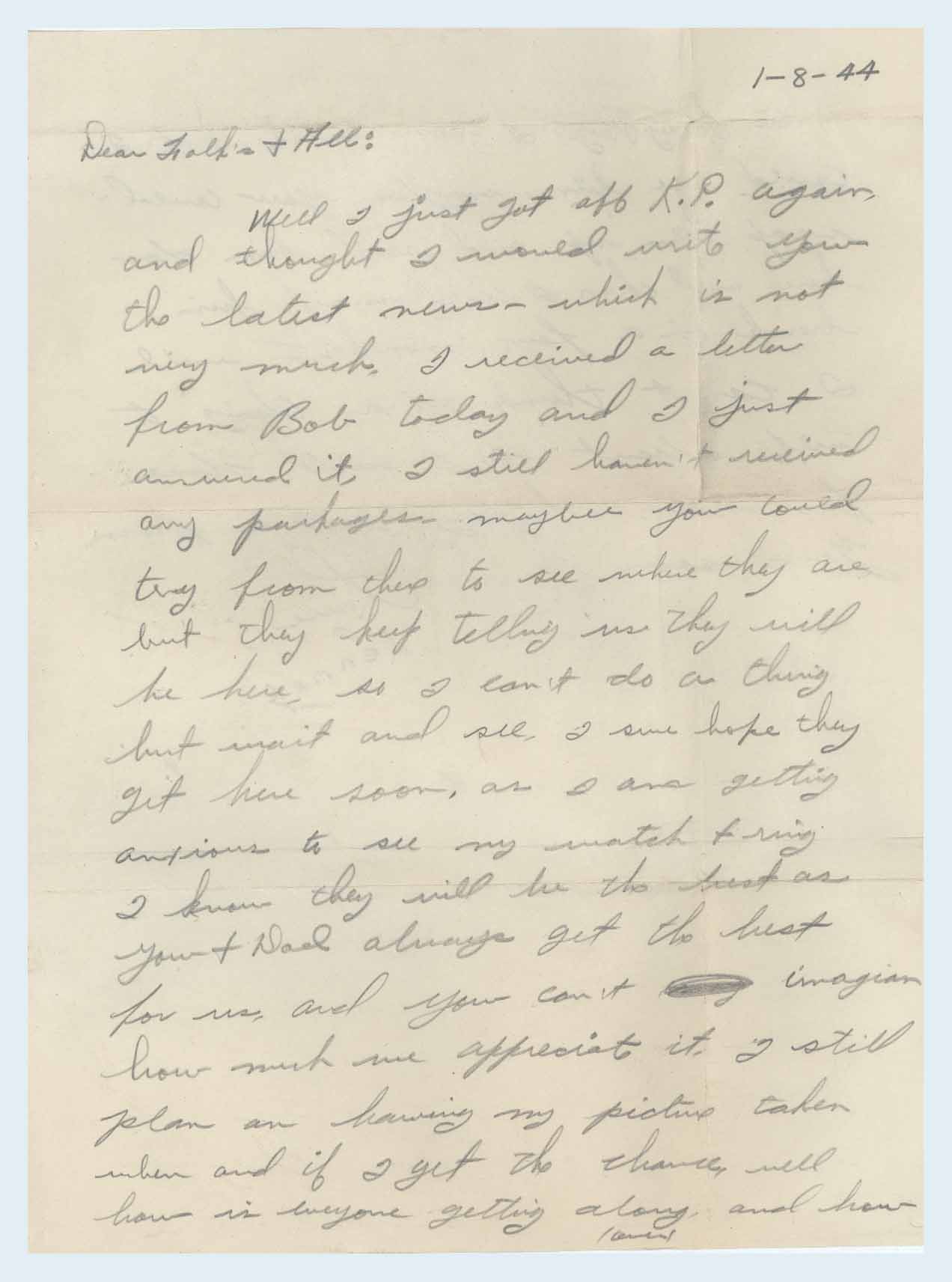 Well I just got off K.P. again, and thought I would write you the latest news- which is not very much, I received a letter from Bob today and I just answered it, I still haven’t received any packages, maybe you could try from there to see where they are but they keep telling us they will be here, so I can’t do a thing but wait and see, I sure hope they get here soon, as I am getting anxious to see my watch & ring I know they will be the best as you & Dad always get the best for us, and you can’t [scratch out] imagian [sic] how much we appreciate it. I still plan on having my picture taken when and if I get the chance, well how is everyone getting along, and how
