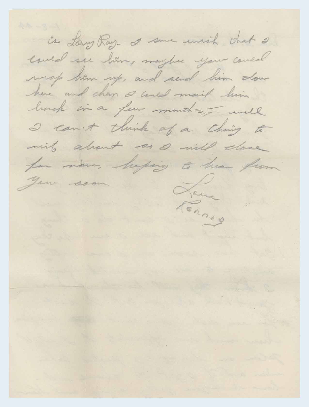 is Larry Ray. I sure wish that I could see him, maybe you could wrap him up, and send him dow [sic] here and then I could mail him back in a few month s, well I can’t think of a thing to write about so I will close for now, hoping to hear from you soon.