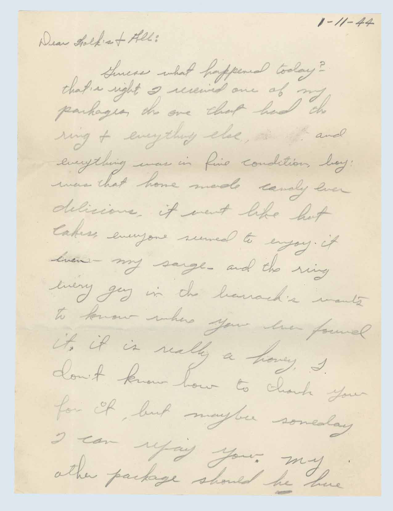 Guess what happened today? that’s right I received one of my packages, the one that had the ring & everything else, [erasure] and everything was in fine condition boy: was that home made candy ever delicious, it went like hot cakes, everyone seemed to enjoy it even – my sarge_ and the ring every guy in the barrach’s [sic] wants to know where you ever found it, it is really a honey, I don’t know how to thank you for it, but maybe someday I can repay you. My other package should be here