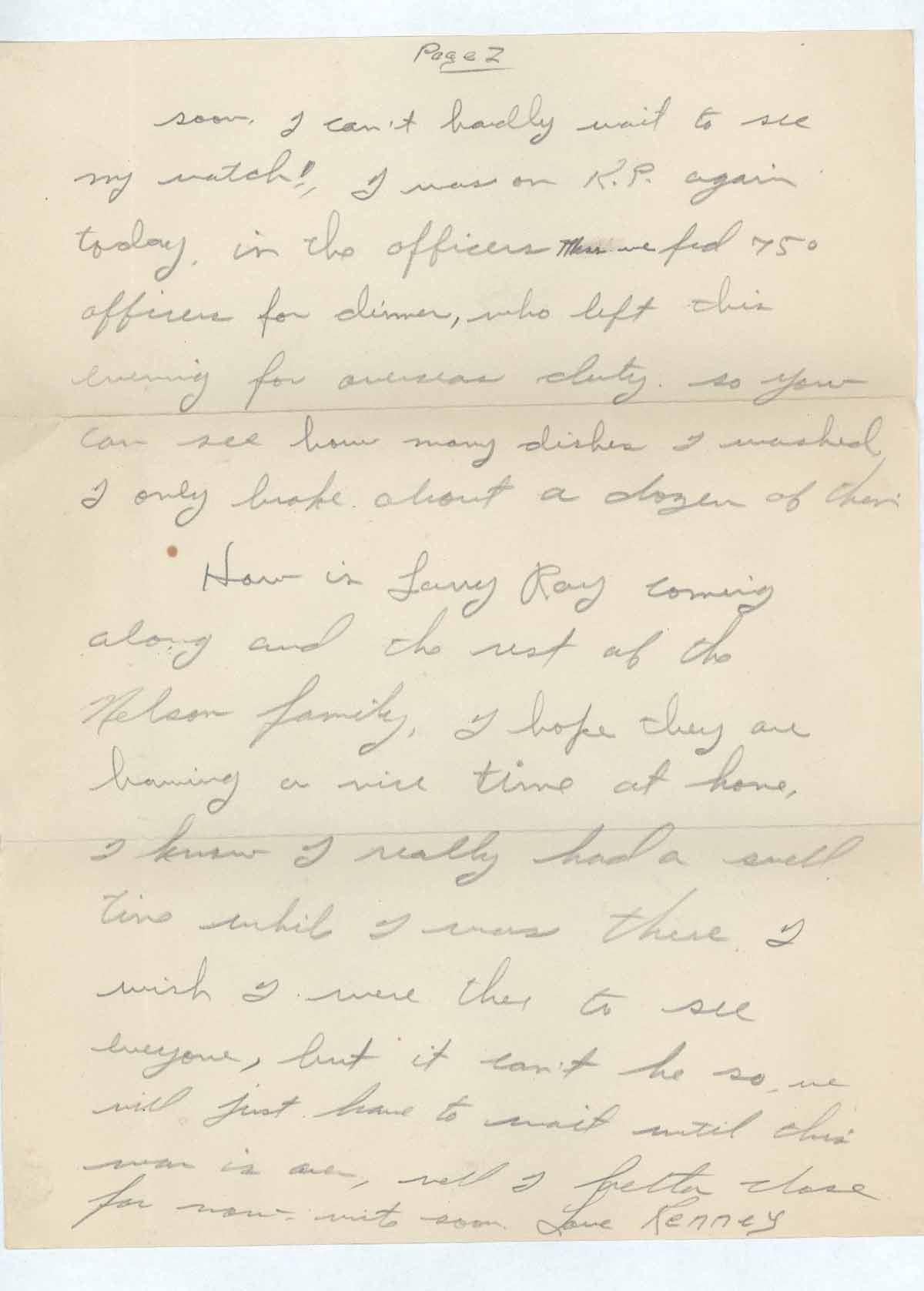 How is Larry Ray coming along and the rest of the Nelson family, I hope they are having a nice time at home, I know I really had a swell time while I was there. I wish I were there to see everyone, but it can’t be so, we will just have to wait until this war is over, well I better close for now, write soon. Love Kenney