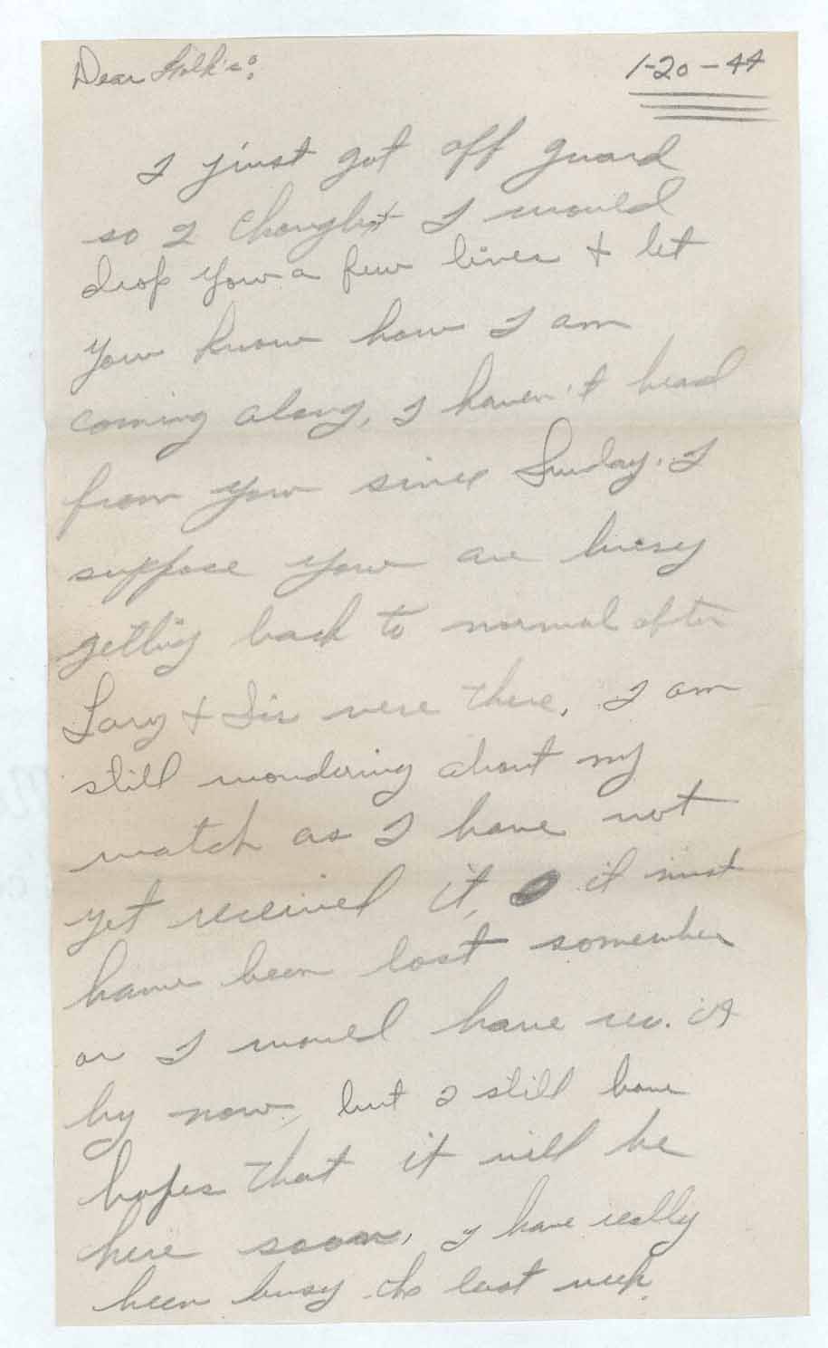 I just got off guard so I thought I would drop you a few lines & let you know how I am coming along, I haven’t heard from you since Sunday, I suppose you are busy getting back to normal after Lary [sic] & Sis were there, I am still wondering about my watch as I have not yet received it, [scratch out] it must have been lost somewhere or I would have rec. it by now, but I still have hopes that it will be here soon, I have really been busy this last week,