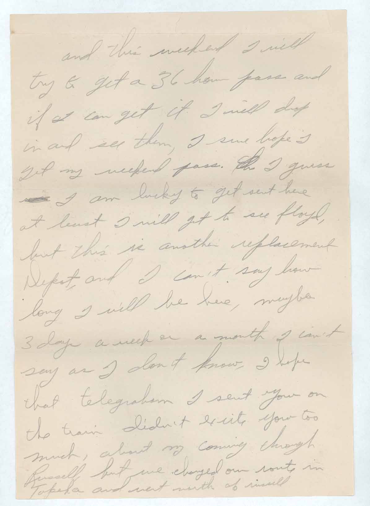 and this weekend I will try to get a 36 hour pass and if I can get it I will drop in and see them, I sure hope I get my weekend pass. [scratch out] I guess [scratch out] I am lucky to get sent there at least I will get to see floyd, [sic] but this is another replacement Depot, and I can’t say how long I will be here, maybe 3 days a week or a month I can’t say as I don’t know, I hope that telegraham [sic] I sent you on the train didn’t excite you too much, about my coming through Russell, but we changed our route in Topeka and went north of Russell [sic]