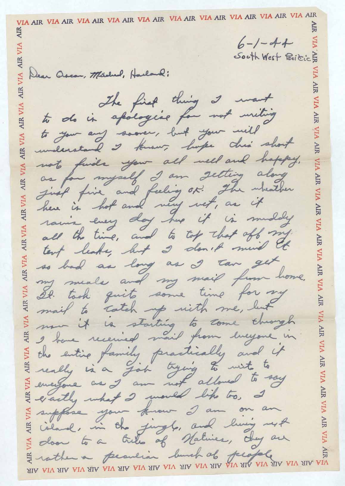 The first thing I want to do is apologize for not writing to you any sooner, but you will understand I know, hope this short note finds you all well and happy, as for myself I am getting along just fine and feeling OK. The weather here is hot and very wet, as it rains every day here it is muddy all the time, and to top that off my tent leaks, but I don’t mind it so bad as long as I can get my meals and my mail from home. It took quiet some time for my mail to catch up with me, but now it is job trying to write to everyone as I am not allowed to say exactly what I would like too, I suppose you know I am on an island, in the jungle, and living next door to a tribe of Natives, they are rather a peculiar bunch of people [sic]