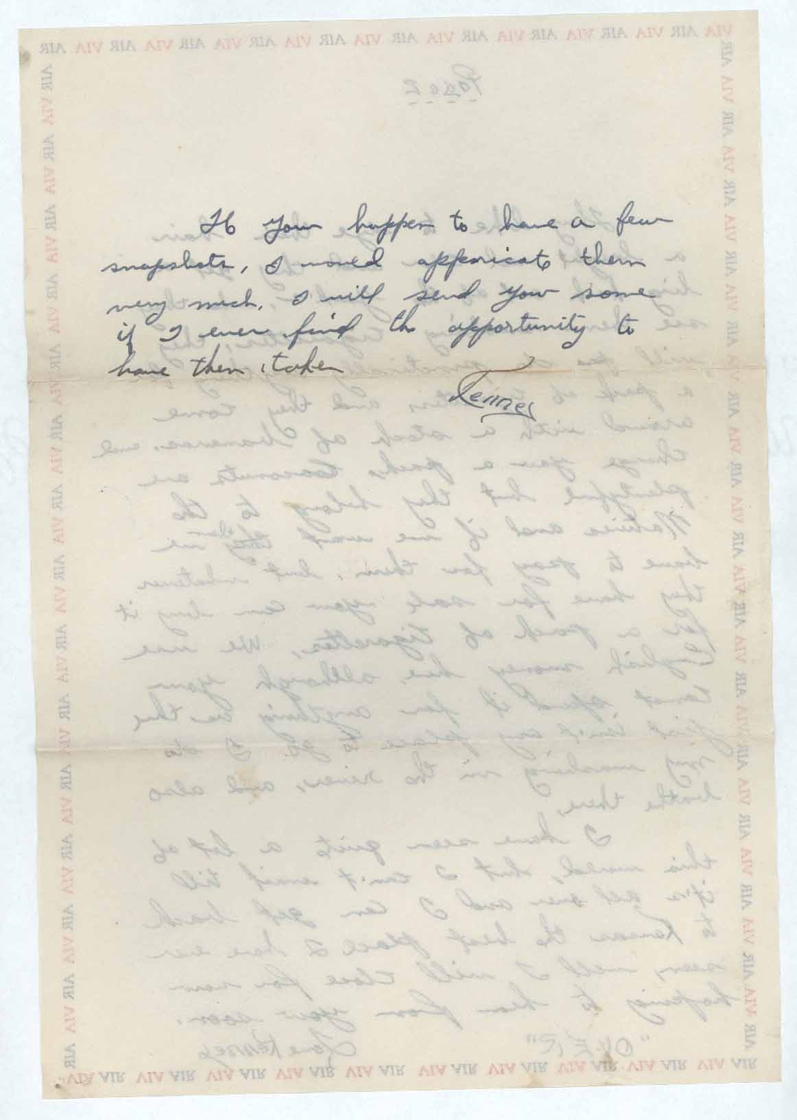 If you happen to have a few snapshots, I would appreciate them very much. I will send you some if I ever find the opportunity to have then [sic] taken