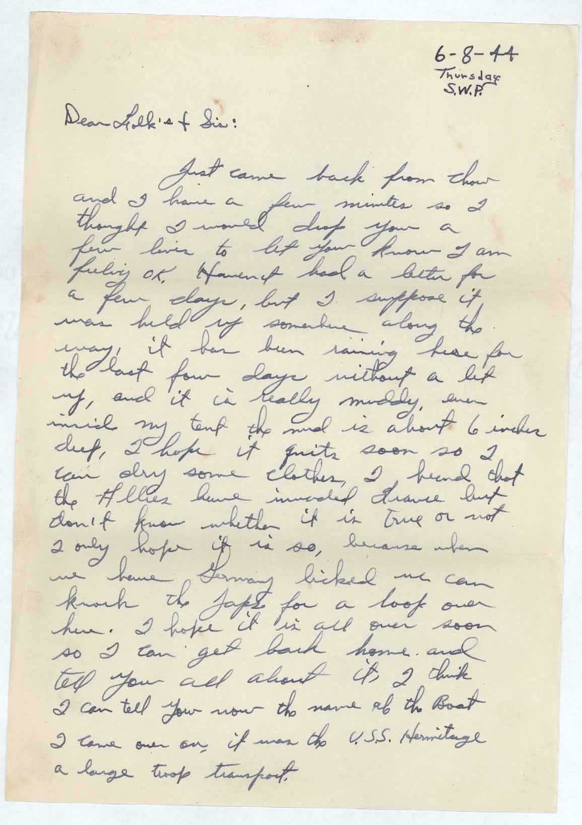 Just came back from chow and I have a few minutes so I thought I would drop you a few lines to let you know I am feeling OK. Haven’t had a letter for a few days, but I suppose it was held up somewhere along the way, it has been raining here for the last few days without a let up, and it is really muddy, even inside my tent the mud is about 6 inches deep, I hope it quits soon so I can dry some clothes, I heard that the Allies have invaded France but don’t know whether it is true or not I only hope it is so, because when we have German licked we can knock the Japs for a loop over here, I hope it is all over soon so I can get back home and tell you all about it, I think I can tell you now the name of the Boat I came over on, it was the U.S.S. Hermitage a large troop transport.