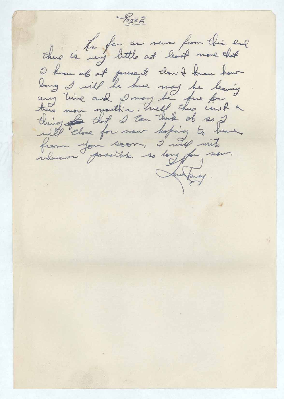 As far as news from this end there is very little at least none that I know of at present, don’t know how long I will be here may be leaving any time and I may be here for two more month’s, well there isn’t a thing for that I can think of so I will close for now hoping to hear from you soon, [sic] I will write whenever possible. so [sic] long for now.