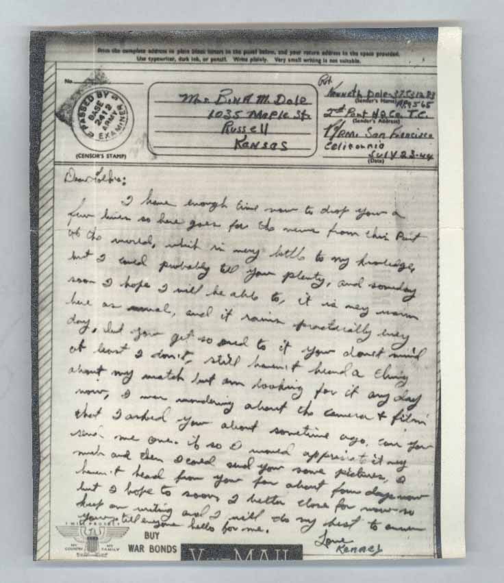 I have enough time now to drop you a few lines so here goes for the news from this Part [sic] of the world, which is very little to my knowledge, but I could probably tell you plenty, and someday soon I hope I will be able to, it is very warm here as well, and it rains practically every day, but you get so use to it you don’t mind at least I don’t, still haven’t heard a thing about my watch but am looking for it any day now, I was wondering about the camera and film that I asked you about sometime ago, can you send me one, if so I would appreciate it very much and then I could send you some pictures, I haven’t heard from you for about four days now but I hope to soon I better close for now so keep on writing and I will do my best to answer you . Tell everyone hello for me.
